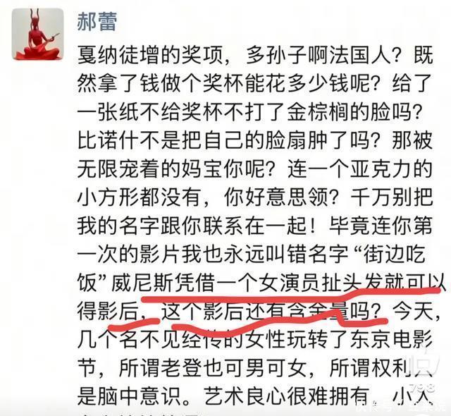 “扯头发”,这三个字,瞬间成了引爆舆论的导火索。 郝蕾是谁?在观众心中,她几乎是“演技派”的代名词。由她(传闻中)来质疑“含金量”,这杀伤力非同小可。紧接着,这张截图还捎带批评了东京、戛纳等电影节,直指存在“运作”空间。