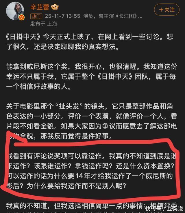 一石激起千层浪。 舆论的矛头,迅速从“恭喜影后”转向了“资本运作”。那些原本在电影预告中一闪而过的“扯头发”争议性片段,被无限放大、反复审视。人们开始窃窃私语:“这奖,是不是‘做’出来的?”“评审团是不是不公正?” 一场本该属于艺术的胜利,转眼间,被拖入了一场关于“阴谋”与“黑幕”的罗生门。 影后的雷霆反击:“灵魂六连问” 面对这场突如其来的舆论海啸,辛芷蕾没有选择沉默,也没有打太极。11月7日当晚,她选择了一种最刚、最直接的方式——发布长文,正面回应。