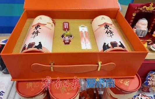 在一楼的曲阜“拱手礼”文创站展位,记者看到,这里以“孔子”“拱手礼”等为主题,把传统文化变成生活中有趣的文创产品,比如“自行束脩以上,吾未尝无诲焉”的肉干礼盒,“礼敬先生”礼盒、祈福金笔……让人感受到齐鲁文化的厚重与现代生活的情趣。